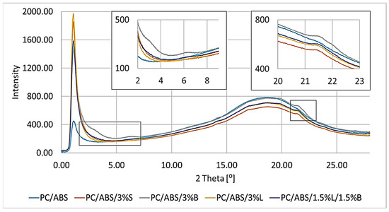 When analyzing the presented results of the WAXS study for the PC/ABS blend and composites based on it, it was noticed that the introduced fillers were well dispersed in the polymer matrix (Figure 10), which confirms the previously presented SEM/EDS results.