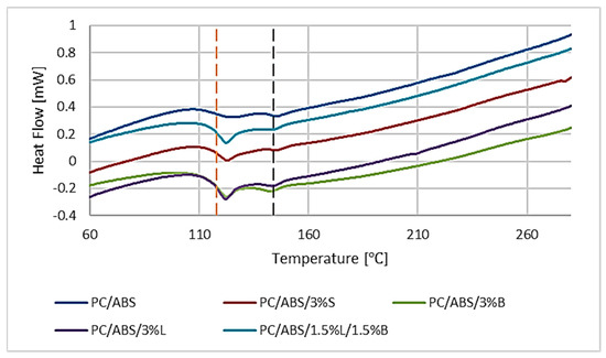 Figure 12 shows the DSC thermograms of the second heating of the PC/ABS polymer blend and the composites based on it. The inflection observed at about 145 °C is related to the PC glass transition. ABS is a copolymer with two glass transition temperatures, one for the polybutadiene phase and one for the styrene-acrylonitrile phase. Due to the test conditions used, it was not possible to determine Tg for polybutadiene, which is about −80 °C. On the other hand, visible bends at a temperature of about 118 °C may be associated with the Tg of the styrene-acrylonitrile phase [44]. No significant changes in glass transition temperatures were observed for any of the tested composites compared to the unfilled polymer blend.