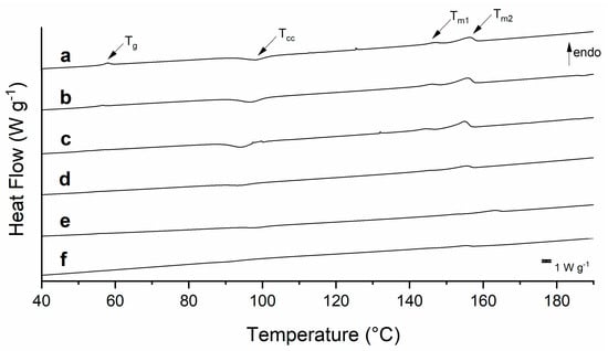 DSC curves for (a) PLA; (b) P95c5; (c) P85C15; (d) PLAGE; (e) P95C5GE; and (f) P85C15GE.