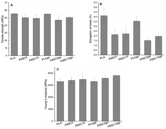 The effect on tensile strength (TS) of chitosan and grape seed extract incorporated in PLA-based injection-molded shoulder bars was observed as a function of the chitosan loading of 5% and 15% (w/w) and the addition of 1% of the GE regarding the dry weight of biopolymers (Figure 3A). The TS of the pure PLA specimen was found to be 55.4 ± 1.8 MPa, which means a very brittle behavior, a value in agreement with the literature [26]. Adding chitosan decreases the TS in the binary blends, displaying values up to 50.4 ± 4.4 MPa (P95C5) and 49.4 ± 4.1 MPa (P85C15). Even though a slight decrease in TS was noticed, the change is not statistically significant. In the same way, no change in tensile strength was observed after incorporating the grape seed extract into the neat PLA sample. Nevertheless, comparing this set of samples, the introduction of the extract reduces the TS values in P85C15GE (50.5 ± 1.2 MPa) and P95C5GE (47.0 ± 6.0 MPa).