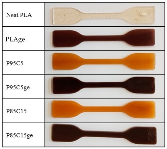 The color difference (ΔE) of the samples was evaluated in comparison to pure PLA (Table 4). The ΔE was in the range of 40 after the addition of chitosan (P95C5 and P85C15), confirming the color changing behavior of the samples. As mentioned earlier, the high ΔE value can be associated with the thermocompression molding process used in sample preparation and was not significantly dependent on the polysaccharide concentration. As expected, the ΔE for the samples after the inclusion of the GE rose due to the intrinsic characteristic of natural extracts being colorful.