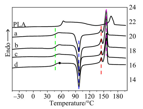 where is the mass fraction of PLA in the composites, is the melting enthalpy of the melting endotherms obtained from the DSC curves, and is the melting enthalpy of 100% crystalline PLA and its value was 93 J·g−1 [17,37].