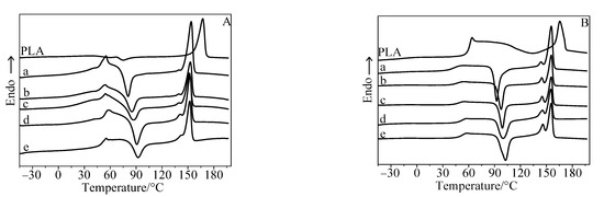 DSC curves of neat PLA and the PLA/thermoplastic starch/SiO2 composite. (A) The composites with a thermal history; (B) the composites without a thermal history. Curve (a) is for 10 parts, (b) is for 15 parts, (c) is for 20 parts, (d) is for 25 parts, and (e) is for 30 parts of thermoplastic starch.