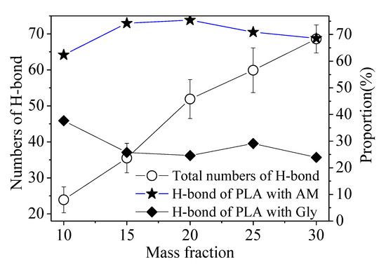 The interfacial binding energy consists of electrostatic force and van der Waals force, in which the two forces account for almost the same contributions (~50% vs. ~50%) for each mass fraction of thermoplastic starch in the composites, as shown in Figure 5. For the electrostatic force, the hydrogen bond (H-bond) energy of PLA with thermoplastic starch has a dominant proportion. The relative H-bond proportion of PLA with AM is around 70%, and 30% for PLA with glycerol, just as shown in Figure 6. It can be inferred that the H-bond energy of PLA with AM has an essential effect on the crystallization of the PLA on the interface.