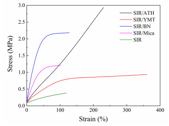 Figure 2 shows the stress–strain curves of the SIR composites with various fillers. As can be seen from the figure, the elastic modulus of the SIR/BN composite material is very large when the elongation is below 50%. However, when the elongation is higher than 50%, the elastic modulus drops sharply, and the tensile strength between 50% and 128% is almost unchanged. This is because BN particles form a strong filler network resulting from the high aspect ratio of the filler [22], and the filler network has a strong force, but the action distance is shorter, in the stretching process the filler network will precede the polymer–polymer network and polymer–filler network fracture, for the composite material with BN, the filler and the polymer do not form an effective network. Therefore, when the filler–filler network is broken, the elastic modulus of the composite material will be greatly reduced, and the subsequent tensile mainly depends on the polymer–polymer network, but the polymer–polymer network strength of SIR is low so that in the subsequent stretching process, the tensile strength is almost not increased. A similar phenomenon is also observed for the composite filled with mica filler.