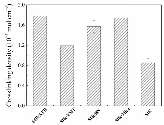 Figure 3 shows the crosslinking density of the SIR composites filled with various fillers. It can be seen from the figure that the addition of various fillers has different effects on the crosslinking density of composite materials, among which pure SIR has the lowest crosslinking density. The interactions between filler particles and rubber matrix also contribute to the crosslinking density [32,35], but no filler–rubber interactions in the pure SIR. After the addition of ATH, BN or Mica, the crosslinking density of the composite is nearly twice that of pure SIR, because after the addition of filler, a filler-matrix and filler–filler crosslinking network will be formed inside the composites. As a result, the mechanical properties of the composite material are improved to a certain extent. As for the SIR/YMT composite, the improvement in crosslinking density is much lower than that of the other three SIR composites. On the one hand, there exists plenty of silanol on the YMT surface, which might capture the free radicals produced by the vulcanization agent. On the other hand, the strong interionic interactions between the YMT layers prevent the dispersion of YMT layers in the rubber matrix, resulting in poor rubber–filler interactions.