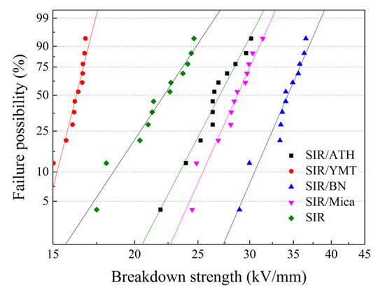 The breakdown strength of the composites was tested according to the test standard of GB/T1695-2005 using a voltage breakdown tester (HCDJC-50kV, Huace Testing Instrument Co., Ltd., Beijing, China) with a stepping voltage of 1 kV/s. The Weibull probability distribution model is one of the main models to describe the insulation failure distribution of electrical equipment, and the value of its shape parameters can reflect the difference in failure mechanism to a certain extent. By analyzing the electrical aging test data of insulating materials, the International Electrotechnical Commission concluded that the electrical aging life of solid insulation materials follows the Weibull distribution. In this paper, the insulation properties of SIR composites are mainly evaluated by using the classical failure model. The Weibull classical failure model is known as the two-parameter Weibull failure model, which is mainly used to describe problems such as electrical insulation and the breakdown life of electrical equipment. Its failure distribution function is: