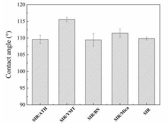 The hydrophobic characteristic is a key factor of silicone rubber insulators to ensure their safe and stable operation [36]. In contaminated and humid conditions, water molecules gather as independent droplets rather than a continuous water film; thus, the surface maintains a high level of anti-flashover performance. Therefore, the hydrophobic surface of silicone rubber composite is of great significance to prevent the failure of insulators. Figure 5 shows the static contact angle of a composite filled with various fillers. It can be seen from the figure that after adding ATH, BN and mica filler, the static contact angle of the composite material is almost the same as that of the SIR without filler, and it can be considered that the addition of these three fillers has little effect on the static contact angle of the composite material. For comparison, the static contact angle of the SIR composite filled with YMT improves from 109.8° to 115.6°. By incorporating YMT, the hydrophobicity of the SIR composite improves but the breakdown strength decreases, which is very important for insulation materials. The insulation performance may be improved by blocking cations of YMT, which needs further investigation in the future. Moreover, the improvement in mechanical properties by adding YMT is not as good as that by adding ATH, BN or mica. Therefore, we consider the YMT might not be a good candidate filler for insulation materials.