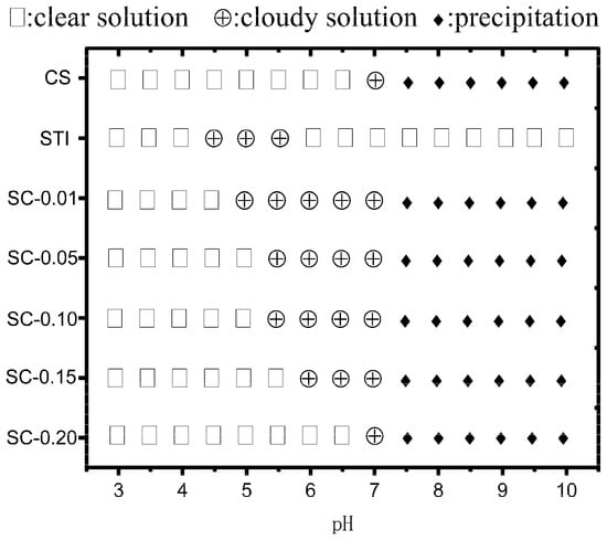 Phase behavior of STI, CS, and mixed systems (SC–0.01, SC–0.05, SC–0.10, SC–0.15, SC–0.20) with pH variation.