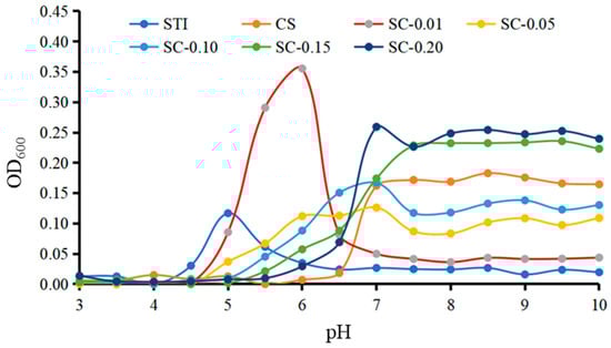 The turbidity changes of STI, CS, and mixed systems (SC–0.01, SC–0.05, SC–0.10, SC–0.15, SC–0.20) over different pHs.