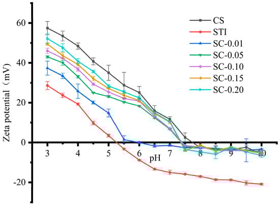 Previous studies have shown that the electrostatic interactions between oppositely charged macromolecules constitute the main driving force to form protein–polysaccharide complexes and coacervates [42,43]. The zeta potential was measured to understand the effects of pH and CS concentration within mixtures on the electrostatic interactions between STI and CS [32]. As shown in Figure 3, the zeta potential of STI decreased from positive to negative values (from 28.63 ± 2.04 to −20.09 ± 0.43 mV) with pH from 3.0 to 10.0 because of the deprotonation of the amino and carboxyl groups carried by STI. The STI had a crossover point at around pH 5.2, where the zeta potential was zero mV, and was considered an isoelectric point (IEP). At this time, the STI solution was prone to precipitate, which confirmed that the turbidity of the STI solution reached its maximum at pH 5.0 (Figure 2). The zeta potential of CS also decreased from 57.47 ± 3.30 mV to −5.71 ± 0.29 mV with the increasing of pH from 3.0.0 to 10.0. CS dispersions displayed a positively charged polyelectrolyte behavior at pH 3.0 to 7.5, which is commonly attributed to the protonation of the glucosamine segments to form ammonium groups (–NH3+) [44]. CS dispersions displayed a negatively charged polyelectrolyte behavior at pH 8.0 to 10.0, and the zeta potential was close to zero mV. The zeta potential of CS decreased with the increase in the value of pH. The reduction in the zeta potential of CS could weaken the repulsion forces among individual molecules, resulting in the formation of large-sized aggregates with the turbidity being increased, which is consistent with the CS turbidity curves from Figure 2.