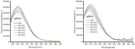 The change of intrinsic fluorescence intensity after the interaction between STI and CS at different pH values was studied by fluorescence spectroscopy. Figure 4 shows the emission spectra of STI (excited at 280 nm) in the presence or absence of CS at pH 4.0 and 6.0. The spectrum of STI was characterized by a single peak with a maximum fluorescence wavelength (λmax) at around 321 nm. It is noteworthy that the fluorescence emission intensity of STI was higher at pH 4.0 than pH 6.0, which may be because of the STI at pH 6.0 having weaker intermolecular repulsion and stronger self-aggregation than that at pH 4.0, and more fluorescent groups being wrapped, resulting in weaker fluorescence emission intensity [9]. At pH 4.0, with the increase of CS (no intrinsic fluorophore) concentration, the fluorescence emission spectrum of STI changed significantly, indicating that there is a certain degree of interaction between CS and STI molecules. The fluorescence emission intensity decreased gradually with the increase of CS, but the maximum emission wavelength of STI remained unchanged, indicating that the presence of CS has no obvious effect on the structural conformation of STI. At pH 6.0, the addition of CS also affected the fluorescence emission intensity of STI. With the increase of CS (no intrinsic fluorophore) concentration, the emission intensity of STI intrinsic fluorophore gradually decreased, indicating the occurrence of interaction between CS and STI molecules at pH 6.0. Unlike at pH 4.0, the maximum emission wavelength (λmax) of STI was blue-shifted as the CS concentration was increased at pH 6.0 with the peak position shifting to 319 nm. The result suggests that CS affects the structural conformation of STI and the interaction between STI and CS may form the CS–STI complex at both pH values via interaction. The fluorescence quenching phenomenon of STI could be attributed to the presence of inter and intramolecular interactions among the protein and polysaccharide chains. The intrinsic fluorophore of STI is surrounded by CS macromolecules, which inhibit STI fluorescence emission. Furthermore, CS is a polysaccharide with an NH3+ group (at pH < pKa = 6.4), and, together with other electron-deficient groups such as protonated histidine, lysine, and –COOH, may provoke the quenching of tryptophan residues [9]. The biological macromolecules are positively charged and the most important interaction types may be hydrophobic interaction and H bonding at pH 4.0 in the STI–CS complex. However, biological macromolecules carry heterogeneous charges and the formation of supramolecular structures may be driven by electrostatic interaction and stabilized by the H bond at pH 6.0.