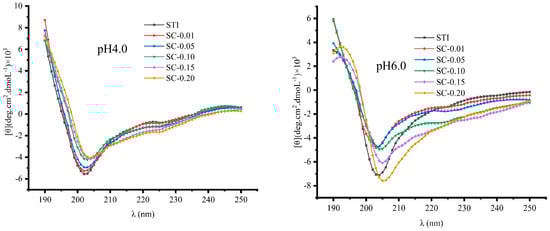 Far-UV CD measurements of STI solutions and STI–CS mixtures at different pH (4.0, 6.0) were performed using a dichrograph instrument (MOS–500, BioLogic, Seyssinet-Pariset, France), equipped with a quartz cuvette of 0.1 cm light-path length [25]. All far-UV CD spectra (190~250) were obtained in a nitrogen atmosphere at 25 °C. The spectra were analyzed via https://bestsel.elte.hu/index.php (accessed on 7 September 2022) to calculate the α-helix, β-fold, β-turn, and random curl percentages.