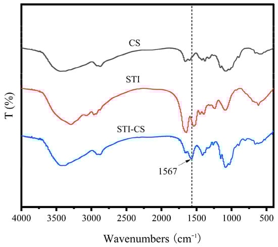 Fourier infrared spectra of CS, STI, and STI–CS (SC–0.10, pH 6.0).