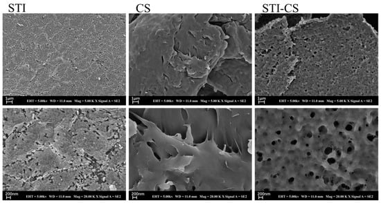 SEM micrographs of freeze-dried STI, CS, and STI–CS (SC–0.10, pH 6.0).