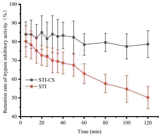 Figure 8 shows the effect of complex coacervates (CS–STI) on STI stability in simulated gastric juice. Compared with free STI, CS–STI showed excellent stability in the presence of pepsin. After 50 min, the retention of trypsin inhibitory activity of STI was 67.47%. However, the retention of trypsin inhibitory activity of CS–STI was more than 82.41%. After 120 min, the retention of trypsin inhibitory activity of STI was 50.18%, but the retention of trypsin inhibitory activity of STI–CS was 78.73%. These results indicate that the formation of CS–STI complex coacervates was an effective approach to protect the STI activity. CS could improve the stability of STI in simulated gastric juice.