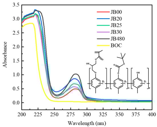 It can be seen from the UV spectrum that JB20, JB25 and JB30 have strong absorption peaks at 220 nm and 280 nm. The electronic absorption band of the carbonyl chromophores in BOC is at 195 nm. The redshift in absorbance is due to the combination of the hydroxyl group of JB20, JB25 and JB30 with a BOC group containing π-bonds (p-electron), resulting in a conjugation effect, and the group generally has an electron-pushing conjugate effect. The substituents on the benzene rings of JB20, JB25 and JB30 shift the absorption peaks in the long wavelength direction and enhance the absorbance, and the magnitude of the absorption peak shift due to the substituents is affected by the possible tautomerism in the molecule. The hydroxyl group acts as an electron-donating group and enhances the chromogenic group at the same time. Even if the benzene ring is connected with an electron-withdrawing group, the maximum absorption wavelength of the substituted benzene will also show a certain additive effect; thus, the modification of BOC has an effect on the UV absorbance of polymers JB20, JB25 and JB30. The strong absorption of JB20, JB25 and JB30 at 204 nm indicates the presence of benzene in aromatic compounds in the E2-band. The strong absorption of JB20, JB25 and JB30 at 210-250 nm indicates a π-bonded conjugated K absorption band. The weak absorption of JB20, JB25 and JB30 in the R-band (the R-band is the result of the transition of the lone pair electrons of the unbonded electrons on the heteroatom connected to the double bond to the π* antibonding orbital, which can be simply expressed as n→π*) at 250-300 nm is because the lone pair of electrons on the unbonded C=O attached to the double bond jumps to the π* reverse orbital. In addition, the molecule also contains a simple nonconjugated and n-electron carbonyl chromogenic group [24]. It is seen from Figure 3 that JB20, JB25 and JB30 are almost transparent near 250 nm and above 300 nm, so there is no conjugated system in the molecules of JB20, JB25 and JB30 in the band above 300 nm.
