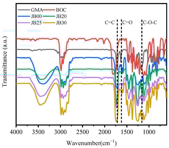 The infrared spectra of JB00, JB20, JB25 and JB30 with different BOC contents are shown in Figure 4. The peaks at approximately 1735 and 1635 cm−1 correspond to the C=C and C=O stretching vibrations, respectively [25,26]. The presence of a double split peak at 1165 cm−1 proves the existence of the methacrylate GMA double bond, and the peak at 1165 cm−1 corresponds to the symmetric stretching resonance of the other C-O-C group [27]. JB00, JB20, JB25 and JB30 have no obvious sharp peak shape at 1165 cm−1, but JB00, JB20, JB25 and JB30 correspond to a double splitting asymmetric stretching resonance of C-O-C at 1242 cm−1, proving the ring opening of the epoxy group of GMA. GMA corresponds to the stretching resonance of carbonyl C=O at 1716 cm−1, while JB00, JB20, JB25 and JB30 all correspond to the strong absorption peak of carbonyl C=O at 1735 cm−1, which proves the partial ring opening reaction of the epoxy group of GMA grafted onto JB480. Peaks of BOC at 1795 cm−1 and 1117 cm−1 correspond to the strong absorption peaks of carbonyl C=O and C-O, respectively, and JB20, JB25 and JB30 correspond to the stretching resonance of carbonyl C=O at 1739, 1748, 1735 and 1744 cm−1, respectively. The absence or a significant decrease in the carbonyl signal can be attributed to the relatively stable lone pair of electrons of carbonyl oxygen [28]. The absence of absorption peaks corresponding to C-O in JB00, JB20, JB25 and JB30 proves that BOC successfully reacted with JB00 by grafting, corresponding to the formation of JB20, JB25 and JB30.