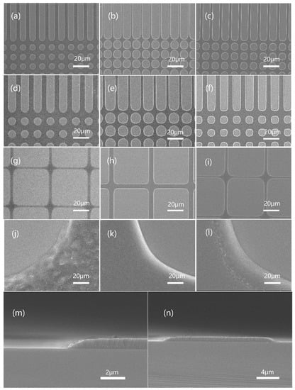 Topography of JB20, JB25 and JB30: JB20 patterned with 6 μm (a), 8 μm (d) and 10 μm (g) masks. JB25 patterned with 6 μm (b), 8 μm (e) and 10 μm (h) masks. JB30 patterned with 6 μm (c), 8 μm (f) and 10 μm (i) masks. Local enlargement of JB20 (j), JB25 (k) and JB30 (l) morphology. Cross-sectional morphology of JB25 under the mask of 16 μm (m,n).