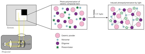 21]. However, due to the high viscosity, the fluidity of the resin was rapidly lowered, making it difficult to flatten and apply uniformly. In addition, photo-curability was lowered due to the increased viscosity, so the irradiated UV power should be increased. This could lead to warpage and cracks due to thermal shock and shrinkage during the curing reaction. In order to overcome this problem, in this study, a PP-type 3D printer capable of controlling various environments, such as temperature, was produced by the lab itself, and various process change experiments were conducted. After sintering, the fabricated structures will be tested for properties such as relative density and hardness to determine their potential for use as ceramic components.
