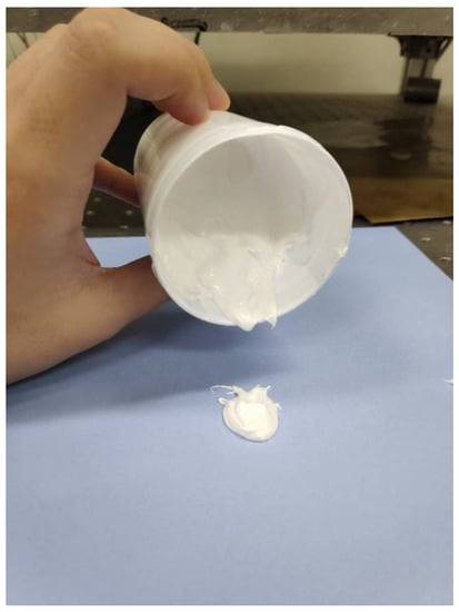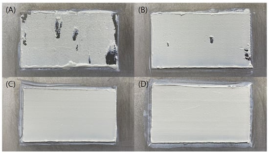 When using a high viscosity resin of 27,000 cps as used in the experiment, there was little fluidity at room temperature, and agglomeration between materials was severe, making it impossible to planarize with a general blade. Since the viscosity of a material is generally inversely proportional to the temperature, a heating blade was designed to instantly increase material flowability. In this case, when the high-viscosity composite resin temporarily contacted the heated blade, the viscosity of the resin was lowered so that planarizing was possible. However, since excessive temperature could cause changes in material properties, the flatness of the resin was visually examined according to the blade temperature. The blade temperature was varied from 15 °C, which corresponds to room temperature, to heated 40 °C, 70 °C, and 100 °C.