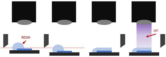 Figure 18, the warpage gradually increased as the printing progressed, eventually stopping the process. This phenomenon also occurred in the big square pattern. In other words, the above two patterns provided some improvement compared to curing the entire area at once, but it did not become a fundamental solution. However, in the case of the micro square pattern, in which the area of each pattern was drastically reduced, it was possible to print without any singularities or warpage in appearance, even though sufficient curing time was irradiated. In addition, as shown in the cross-sectional SEM in