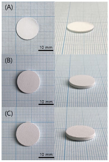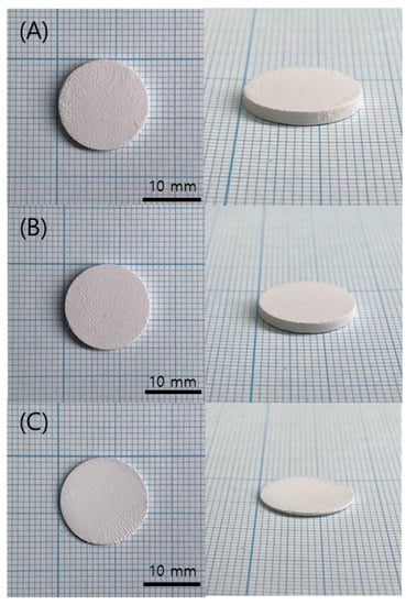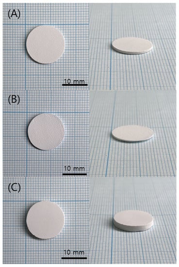 As shown in the previous experimental results, in order to minimize defects such as specimen cracks during sintering, green body specimens should be fabricated through a sufficient curing reaction so that no uncured areas exist. Since the light power was increased as much as possible considering the lifetime of the used DLP, the exposure time was changed to induce a sufficient curing reaction. The exposure time was set to 0.8 s, 1 s, and 1.6 s, respectively, and the cured depth was measured to be 80 µm, 100 µm, and 120 µm in each case. For other process conditions, a blade temperature of 70 °C and a chamber temperature of 40 °C were used, which could increase stability and minimize thermal damage to the resin during printing based on the previous experimental results.