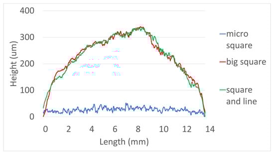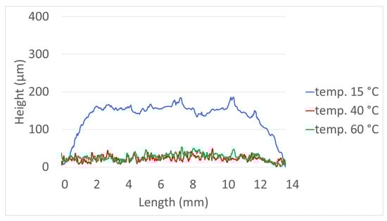 Figure 7. At an internal temperature of 15 °C without heating the chamber, warpage often occurred after curing due to the difference between the heat generated during DLP exposure and the ambient temperature. Accordingly, as the printing was repeated, the internal stress due to the warpage accumulated, causing the edges to lift. Due to this phenomenon, the blade was caught on the edge of the specimen attached to the bed, causing specimen damage and making additional printing impossible. This was also clearly observed in the surface profile data shown in