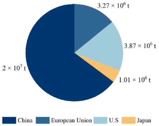 The polymer material used in making tires is mainly composed of NR and SR. Due to the special high elasticity, excellent wear resistance, shock absorption, insulation, and sealing performance, rubber products are widely used in industry and our lives, bringing great convenience to people’s lives. Today, the surge in the number of cars and the booming rubber industry has led to a growing global demand for rubber. Approximately 1.5 billion tires are sold worldwide each year, of which 50 percent are discarded without any treatment [11]. It is widely believed that every new tire sold on the market will have another tire scrapped. The annual production of WTs in some countries is depicted in Figure 2. It is estimated that by 2030, 1200 million WTs will be produced each year [12]. Therefore, both now and in the future, the world is faced with the worldwide problem that it is difficult to recycle the large number of WTs produced each year.