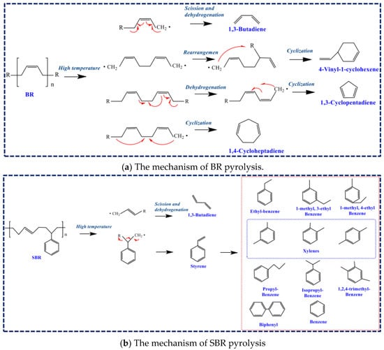 The mechanism of SR pyrolysis; (a) BR, (b) SBR [29] (adapted with permission from Elsevier).