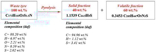 Elemental analysis of tire pyrolysis process (daf means dry ash-free basis) [6] (adapted with permission from Elsevier).
