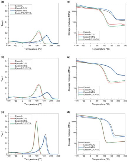 The tanδ (a–c) and storage modulus (d–f) vs. temperature curves of the epoxy/IL, epoxy/PCL/IL, epoxy/CNT/IL, and epoxy/PCL/CNT/IL systems cured with IL-P-TMPP (a,d), IL-P-DCA (b,e), and IL-I-DCA (c,f).