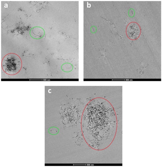 Figure 2 shows the TEM micrographs of the epoxy/PCL/CNT NCs cured with the three ILs. Regardless of the IL used, areas with both individual, well-dispersed CNTs (green circles) and aggregates (red circles) were observed in the three systems. Compared to the corresponding PCL-free reference systems (i.e., the epoxy/CNT/IL NCs) [], the aggregates were bigger and greater in number in the epoxy/PCL/CNT/IL NCs, indicating poorer dispersion of the CNTs in the presence of PCL. This is probably because the epoxy/PCL blend was more viscous than the epoxy resin. The preparation technique used in this study is based on low shear forces (mechanical stirring and ultrasonication) and the greater viscosity hindered the dispersion of the CNTs during the preparation of the NCs.