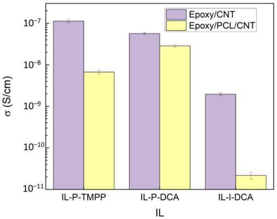 Figure 4 shows the electrical conductivity of the epoxy/PCL/CNT/IL NCs and the reference epoxy/CNT/IL NCs. As can be seen, the electrical conductivity of the NCs decreased when the PCL was added, regardless of the IL used. When the NCs with the different ILs are compared, the drop in conductivity of the IL-P-DCA NC was the lowest compared to the epoxy/CNT/IL system, while that of the IL-I-DCA NC was the highest. These results are perfectly consistent with the nanostructure discussed in the previous section. In the literature, however, the opposite effect has also been observed when PCL was added: the increase it caused in viscosity led to better-dispersed CNTs and, consequently, better electrical properties [,]. This is probably because the experimental procedure used for preparing the NCs was different. In any case, it is noteworthy that, in this study, despite the drop in electrical conductivity observed when the PCL was added to the epoxy/CNT/IL NCs, the three epoxy/PCL/CNT/IL NCs were still above the percolation threshold composition and were semiconductive, in contrast with the insulating nature of the pure epoxy/IL compositions (10−14–10−15 S/cm) []. When compared to the data from the literature [,,], the electrical conductivity values reached fell within the ranges found for epoxy-based NCs filled with low CNT contents (10−9–10−3 S/cm for NCs containing 0.2–0.3 wt% CNT).