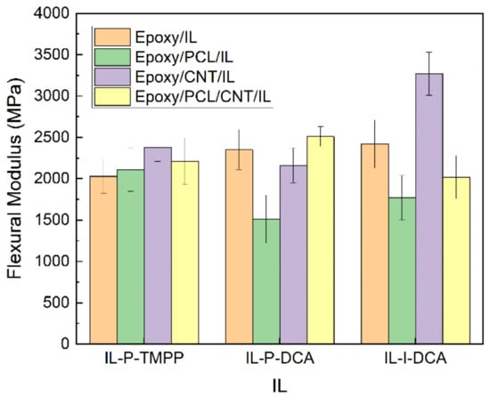 The flexural modulus of the epoxy/PCL/CNT NCs cured with the three different ILs, as well as that of the reference epoxy/IL, epoxy/PCL/IL and epoxy/CNT/IL systems.