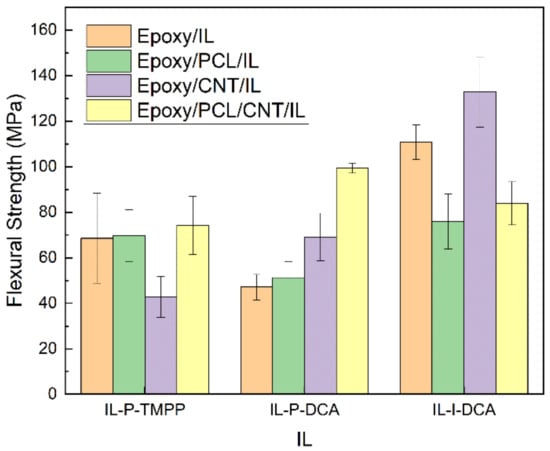 The mechanical performance of the epoxy/PCL/CNT/IL NCs and the reference epoxy/IL, epoxy/PCL/IL, and epoxy/PCL/CNT/IL blends was tested using bending and impact tests. Figure 5, Figure 6, Figure 7, and Figure 8, respectively, show the flexural modulus, flexural strength, ductility, and impact strength of systems cured with the three different ILs.