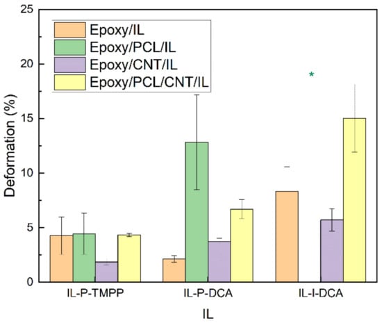 The deformation at break of the epoxy/PCL/CNT NCs cured with the three different ILs, as well as that of the reference epoxy/IL, epoxy/PCL/IL and epoxy/CNT/IL systems. * The specimen slipped and did not break.