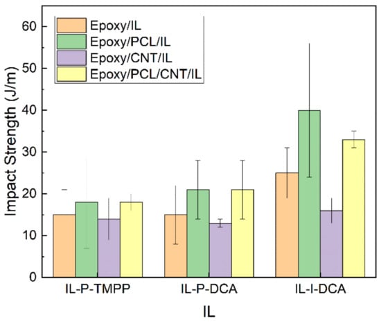 The impact strength of the epoxy/PCL/CNT NCs cured with the three different ILs, as well as that of the reference epoxy/IL, epoxy/PCL/IL and epoxy/CNT/IL systems.