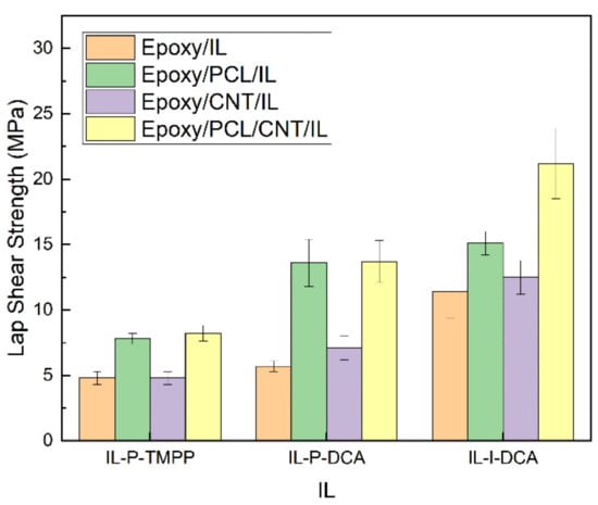 The lap shear strength of the epoxy/PCL/CNT NCs cured with the three different ILs, as well as that of the reference epoxy/IL, epoxy/PCL/IL and epoxy/CNT/IL systems.