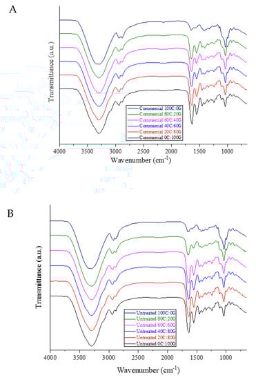FTIR spectra of gelatin-based film incorporated with commercial chitosan (A), untreated chitosan (B), and HHP chitosan (C).