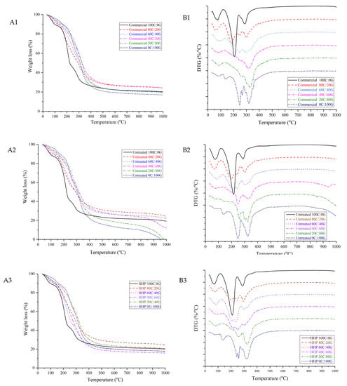 TGA curves of gelatin-based film incorporated with commercial chitosan (A1), untreated chitosan (A2), and HHP chitosan (A3); DTG curves of gelatin-based film incorporated with commercial chitosan (B1), untreated chitosan (B2), and HHP chitosan (B3).