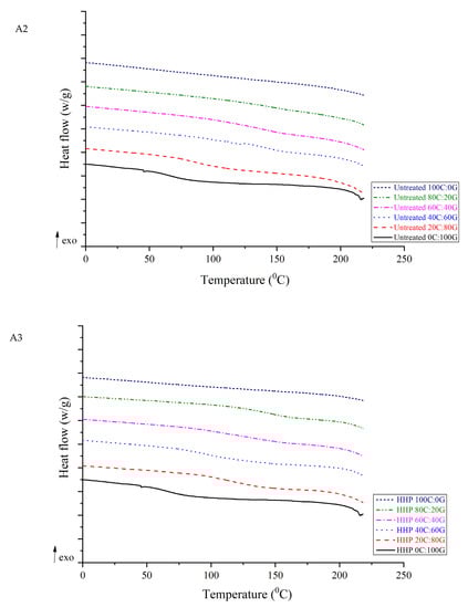 DSC curves of gelatin-based film incorporated with commercial chitosan (A1), untreated chitosan (A2), and HHP chitosan (A3).