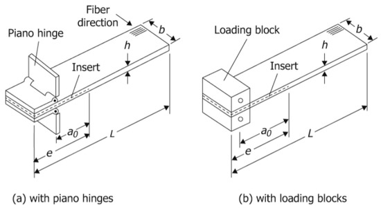 Standardised DCB specimens according to the ASTM D5528-13 [41]: (a) with piano hinges and (b) with loading blocks. Reprinted, with permission, from ASTM D5528-13 [41] Standard Test Method for Mode I Interlaminar Fracture Toughness of Unidirectional Fibre-Reinforced Polymer Matrix Composites, copyright ASTM International. A copy of the complete standard may be obtained from www.astm.org.