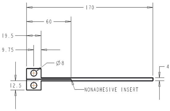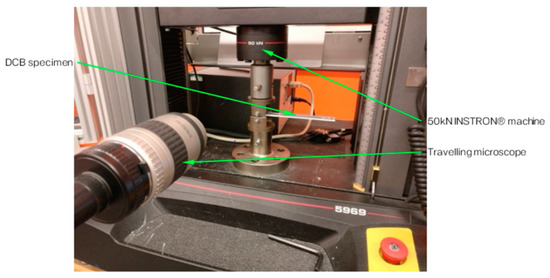 The test specimen is a rectangular laminated composite material with a length of 170 mm and a width of 20 mm. It should have a uniform thickness of 4 ± 0.2 mm and a 60 mm non-adhesive insert in the middle that serves as the point of delamination initiation (Figure 2). The specimen is attached to loading blocks or hinges, which are bonded to one end of the specimen using an epoxy glue, and opening forces are applied to these points. The width and thickness of each specimen were measured and averaged across its length. During the test, the specimen is opened by controlling the opening displacement while measuring the delamination length and load. The DCB specimens were coated in white before the test to improve visibility (Figure 3) and the experimental setup of the test can be observed in Figure 4, which includes a travelling microscope used to record the delamination length and monitor crack growth. The test machine used is an INSTRON® testing machine (Instron Corporation, Norwood, MA, USA) and the cross-head displacement rate for each test was set to 0.5 mm/min.