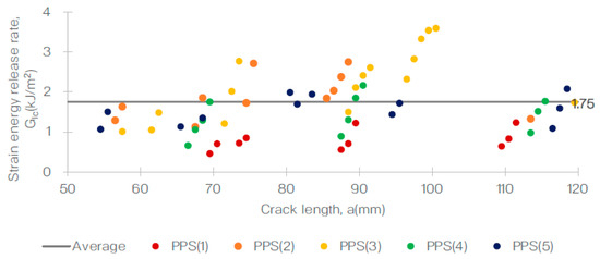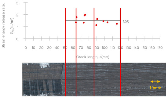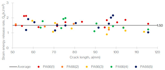 Additionally, the R-curves for both specimens showed a positive slope, which is a common characteristic for these types of materials. This can be observed in Figure 5 and Figure 6 for the T700/PA6.6 and T700/PPS samples, respectively. Furthermore, a representative R-curve is highlighted against the crack length in Figure 7, providing a clear visual representation of the results.