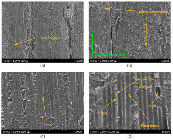 At the microstructural level, the delamination failure extends along the fibres and propagates into the surrounding matrix, as shown in Figure 8 and Figure 9. The textured micro flow and corresponding river lines converge within the matrix next to the fibres, and are the key features of the matrix cleavage. The river lines’ growth direction typically follows the direction of the global crack growth [11].