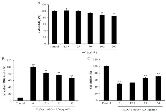 Before investigating the antioxidant activity of AO, the toxicity of AO on Vero cells was investigated. Vero cells were seeded for 24 h. After incubation, Vero cells were treated with AO at a concentration of 12.5, 25, 50, 100, and 200 μg/mL, respectively. After 24 h, cells were treated with MTT solution (50 μL, 2 mg/mL). The cells were incubated for 3 h. After reaction, the supernatant was removed. The formazan was dissolved in DMSO and the absorbance was measured (540 nm) using a microplate reader. To investigate the antioxidant effect of AO, the viability, levels of intracellular ROS, and apoptosis of H2O2-stimulated Vero cells were measured by MTT assay, DCF-DA assay, and Hoechst 33343 staining assay, respectively.