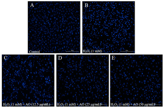 The effect of AO on H2O2-stimulated apoptosis in Vero cells. (A) Nuclear morphology of non H2O2-treated Vero cells; (B) nuclear morphology of H2O2-treated Vero cells; (C) nuclear morphology of Vero cells treated with 12.5 µg/mL of AO and H2O2; (D) nuclear morphology of cells treated with 50 µg/mL of AO and H2O2; (E) nuclear morphology of cells treated with 100 µg/mL of AO and H2O2.