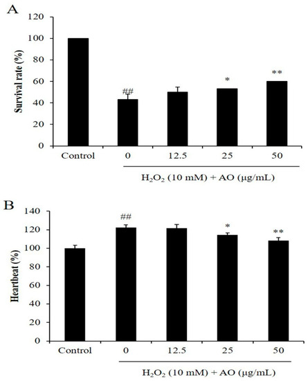 As Figure 3A shows, the survival rates of zebrafish were significantly reduced by H2O2, and improved by AO in a dose-dependent manner. H2O2 reduced the survival rate of zebrafish from 100% to 43.33% (Figure 3A). However, the survival rates of H2O2-stimulated zebrafish were increased to 50, 53.33, and 60% by treatment of 12.5, 25, and 50 μg/mL, respectively (Figure 3A). As shown in Figure 4B, H2O2 significantly stimulated heartbeat disorder, and AO effectively suppressed heartbeat disorder (Figure 3B). The heartbeat of H2O2-treated zebrafish increased to 122.51% from 100% (the control group). However, AO reduced the heartbeat from 122.51% to 121.71, 114.44, and 108.67% at the dose of 12.5, 25, and 50 μg/mL, respectively (Figure 3B). These results indicate that AO effectively increased the survival rate and suppressed heartbeat disorder in a dose-dependent manner.