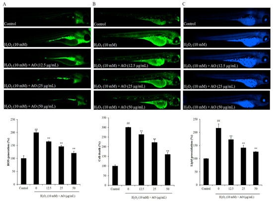 The effect of AO on cell death, ROS level, and lipid peroxidation of H2O2-induced zebrafish was investigated. H2O2 stimulated ROS generation in zebrafish, and AO remarkably scavenged the ROS stimulated by H2O2 in a dose-dependent manner. As shown in Figure 4A, H2O2 significantly elevated the ROS level of zebrafish to 199.73% compared to the control group (100%). However, the ROS level of H2O2-induced zebrafish was decreased to 164.92, 145.86, and 120.43% by treatment of 12.5, 25, and 50 μg/mL AO, respectively (Figure 4A). In addition, H2O2 significantly induced cell death in zebrafish, and AO remarkably suppressed H2O2-stimulated cell death in a dose-dependent manner. The cell death of H2O2-stimulated zebrafish was increased to 300.25% from 100% (the control group), whereas the cell death of H2O2-stimulated zebrafish was decreased to 263.167, 221.68, and 159.68% via the treatment of 12.5, 25, and 50 μg/mL AO, respectively (Figure 4B). Furthermore, H2O2 stimulated lipid peroxidation in zebrafish, and AO remarkably suppressed the lipid peroxidation stimulated by H2O2 in a dose-dependent manner (Figure 4C). H2O2 elevated the lipid peroxidation of zebrafish to 216.40% compared to the control group (100%), whereas the lipid peroxidation of H2O2-stimulated zebrafish treated with a dose of 12.5, 25, and 50 μg/mL AO was decreased to 172.65, 141.21, and 126.08%, respectively (Figure 4C). These results demonstrate that AO effectively suppressed H2O2-induced in vivo oxidative damage in zebrafish via reducing ROS, cell death, and lipid peroxidation.